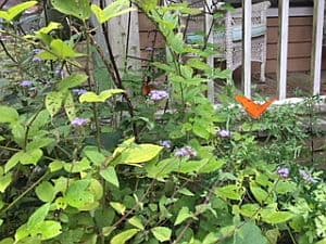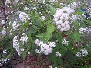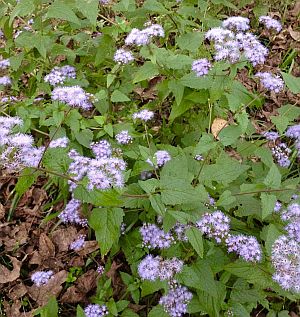 Wild ageratum blooms sparsely in the summer but fall is the best season. The plant has heads of tiny, velvety light blue flower clusters. Leaves are course, simple pubescent, triangular ovate leaves. They look like the cultivated ageratum we see in Spring but are taller and the plant is looser. Heights vary with growing conditions but average 10 –24″. Cut them back in spring for bushier, lower growing plants. They grow wild in my yard. This is a nice element of surprise since I never notice them until they start blooming.